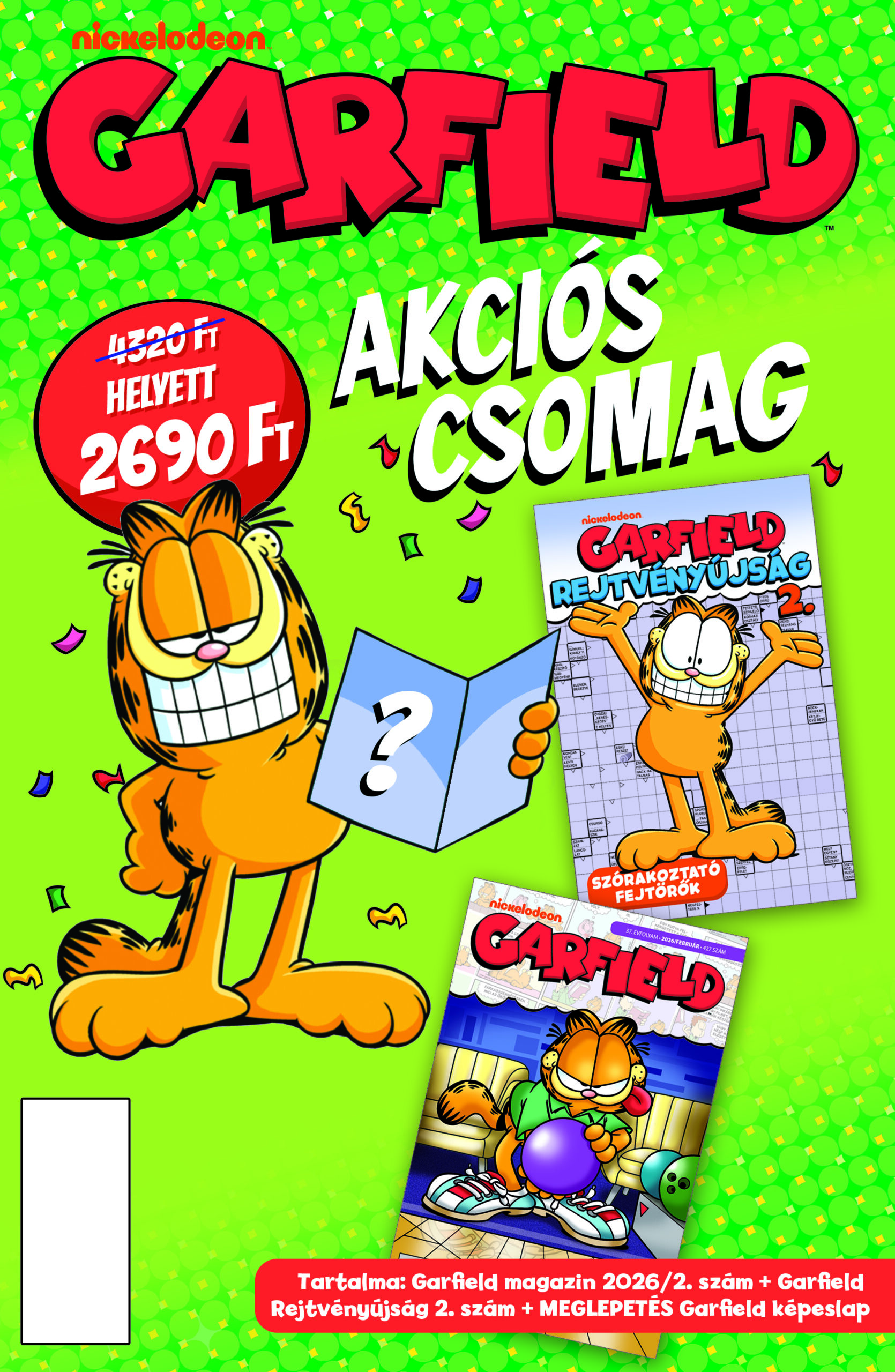 Ismét kapható egy Garfieldos akciós csomagunk a SPAR kiemelt üzleteiben. Ebben a csomagban megvásárolható egy Garfieldos képeslap, a legújabb Garfield Rejtvénylap, valamint a Garfield magazin 2026 februári száma (427).
